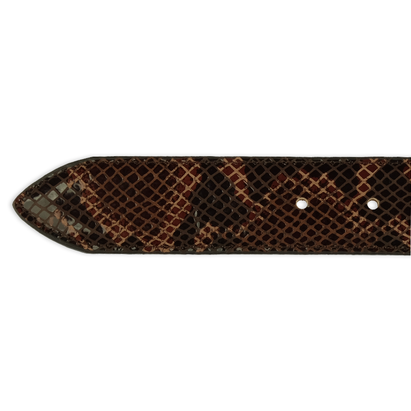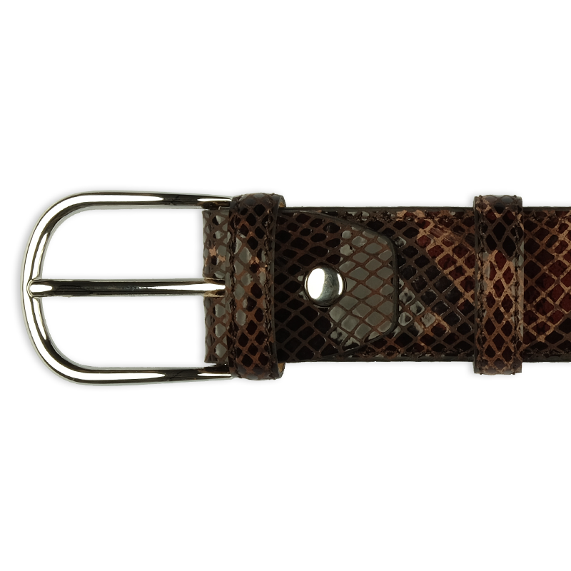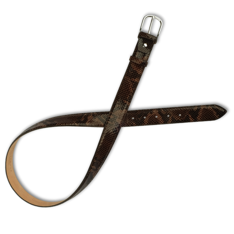 Dieser 3,5cm breite Gürtel wurde aus Rindsleder gefertigt und eindrucksvoll mit einer braunen Schlangenleder-Optik versehen. Die Kante wurde genäht und die Gürtelschnalle ist nickelfrei.