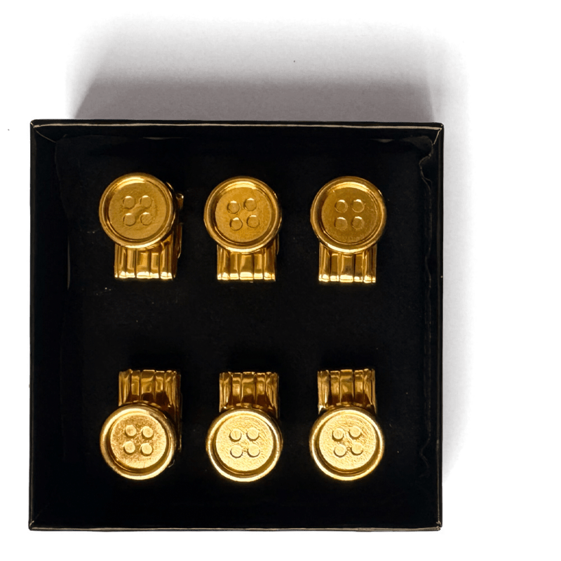 Mit unseren Bracetacs können Sie Ihren Gesellschaftsanzug um sechs leuchtendgoldene Punkte erweitern.