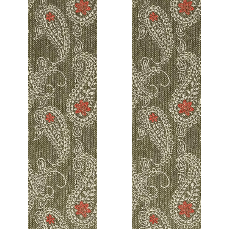 Die Bänder des Hosenträgers Aligia aus Seide sind khaki-weiss-rot zeigen ein Paisley-Muster.